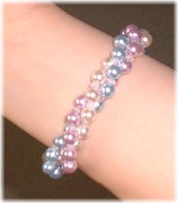 223.3色パール 淡い光 長さ24センチ(アジャスター込み)1400円 写真より少し濃い色なのですが、 パープル、オレンジホワイト、ブルーの3色のガラスパールを使用しています。 ガラスにパール加工を施してあるので、程良い重量感があります。 間には小さな磨りガラス加工のガラスビーズを使い、 柔らかいパールの良さを引き立てるようにしました。 上の左の写真のようにくるくるとひねっていただいても、 そのままつけていただいてもよい、2つの表情のあるブレスレットです。